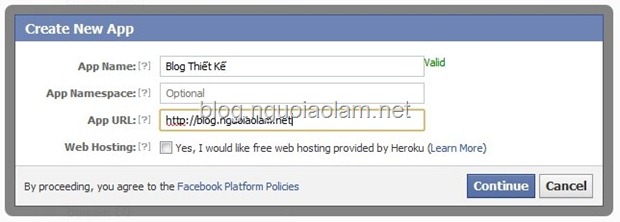 d) Fill in the App Name your blog name and App URL is your blog address. Press "continue"